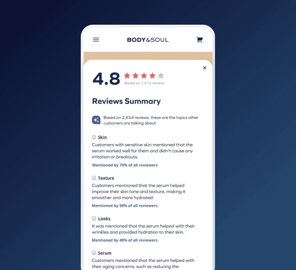 This feature is designed to enhance the review experience by providing concise, AI-generated summaries of all published reviews, along with keywords. This feature allows users to quickly grasp the overall sentiment of customer feedback without having to read through each individual review and offers customers a quick, clear overview of the most important takeaways from customer reviews.