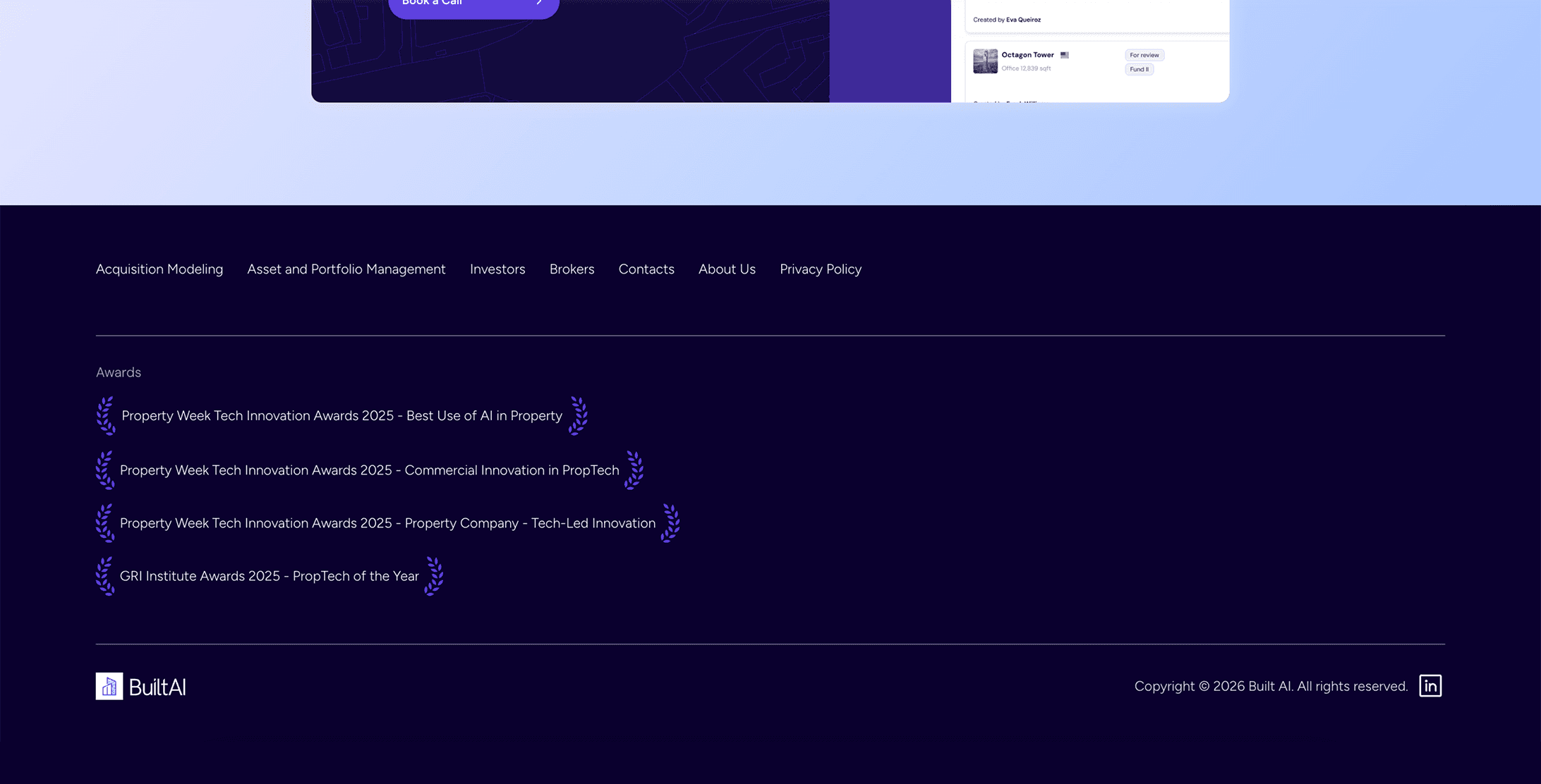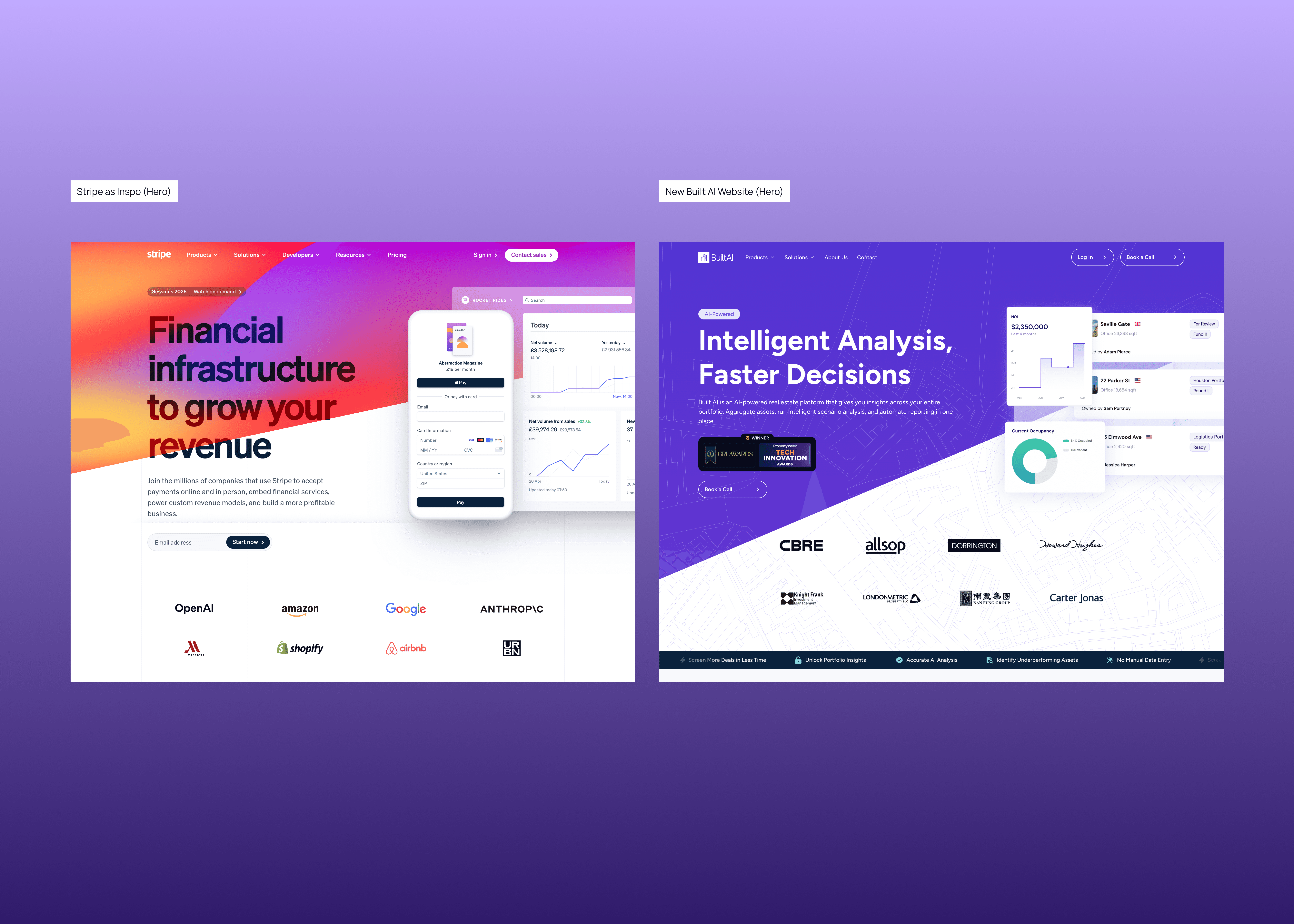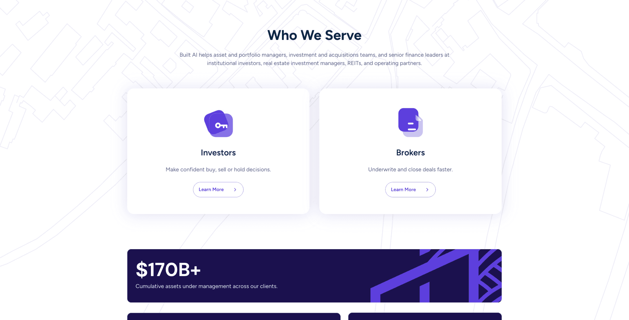 A strong emphasis was placed on trust signals throughout, including client logos, key metrics (e.g. assets under management), and product visuals, reinforcing credibility and helping position Built AI as a reliable platform for institutional-level users.