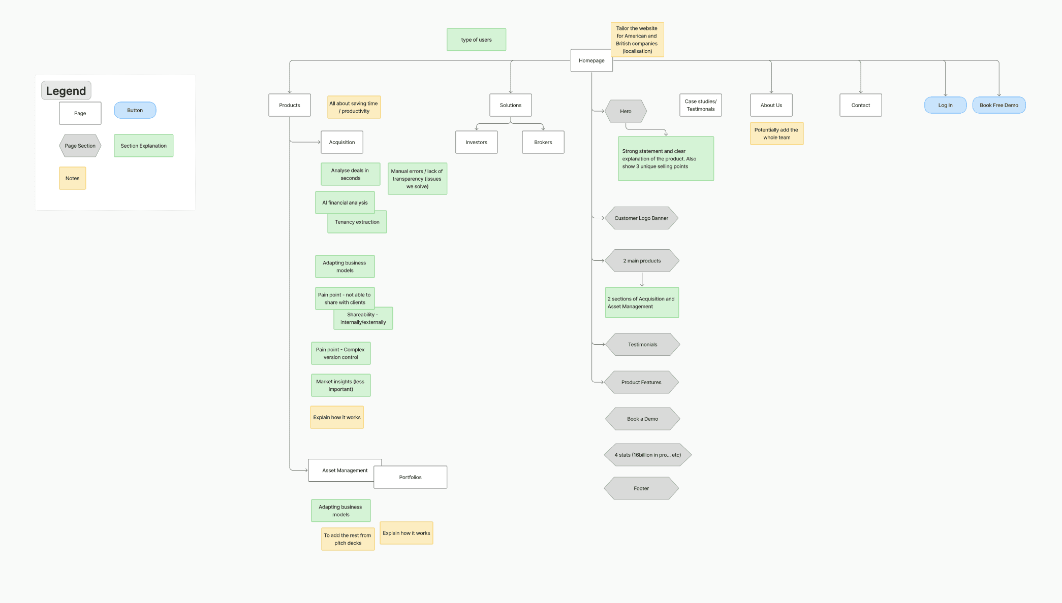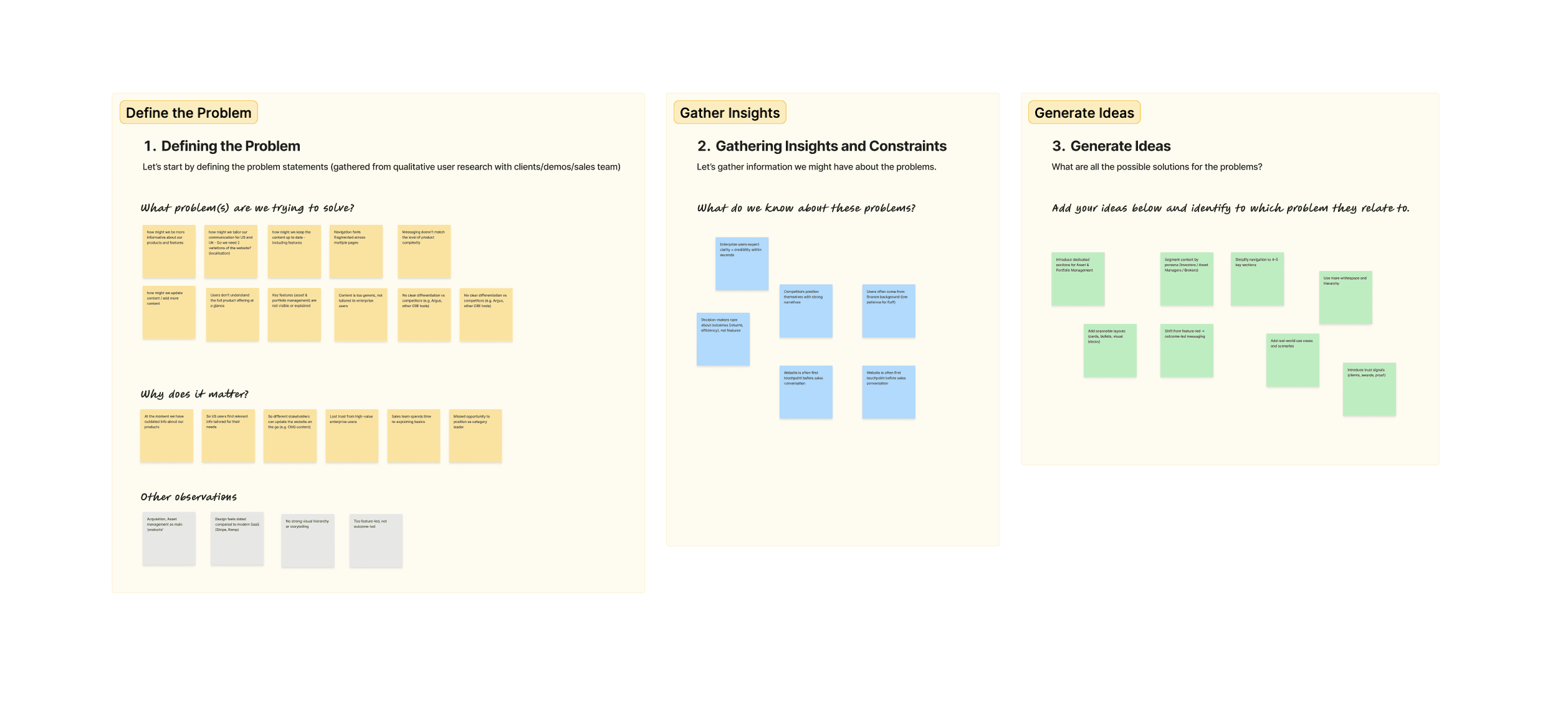 After aligning with C-level stakeholders and the sales team, and clearly defining our target users, we ran focused sessions to define the problem, gather insights, and generate ideas, shaping the first iteration of the site map.