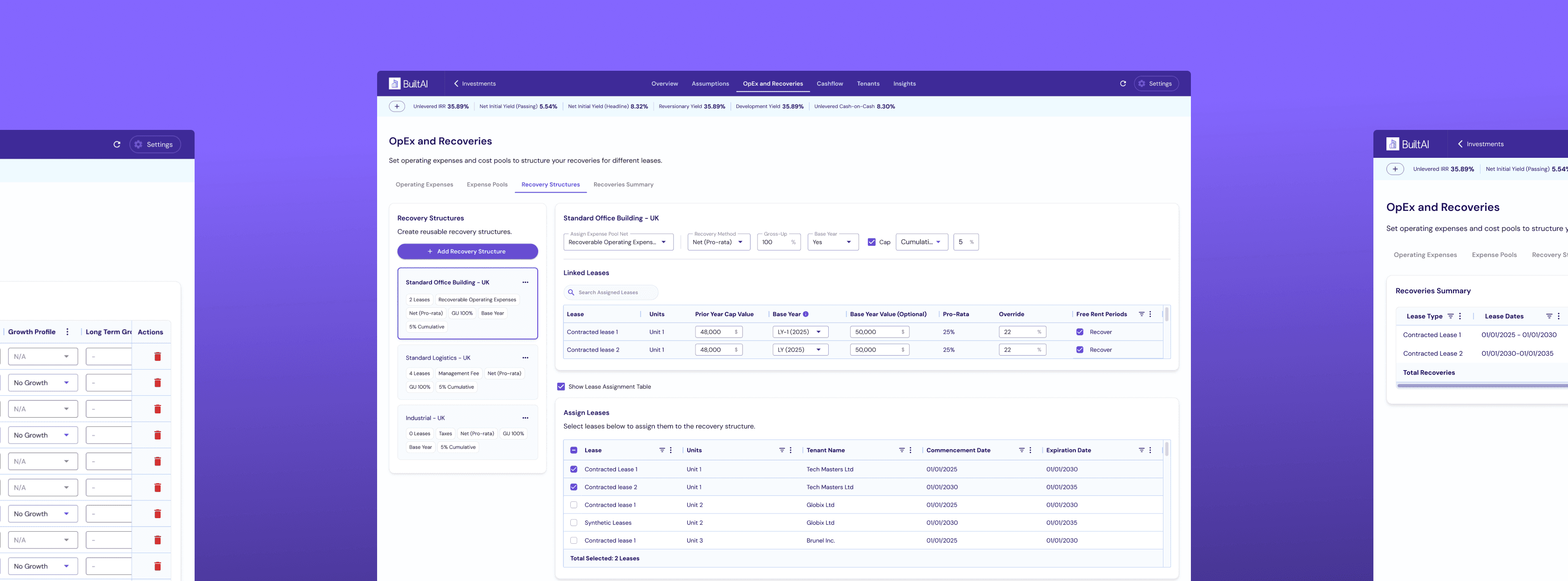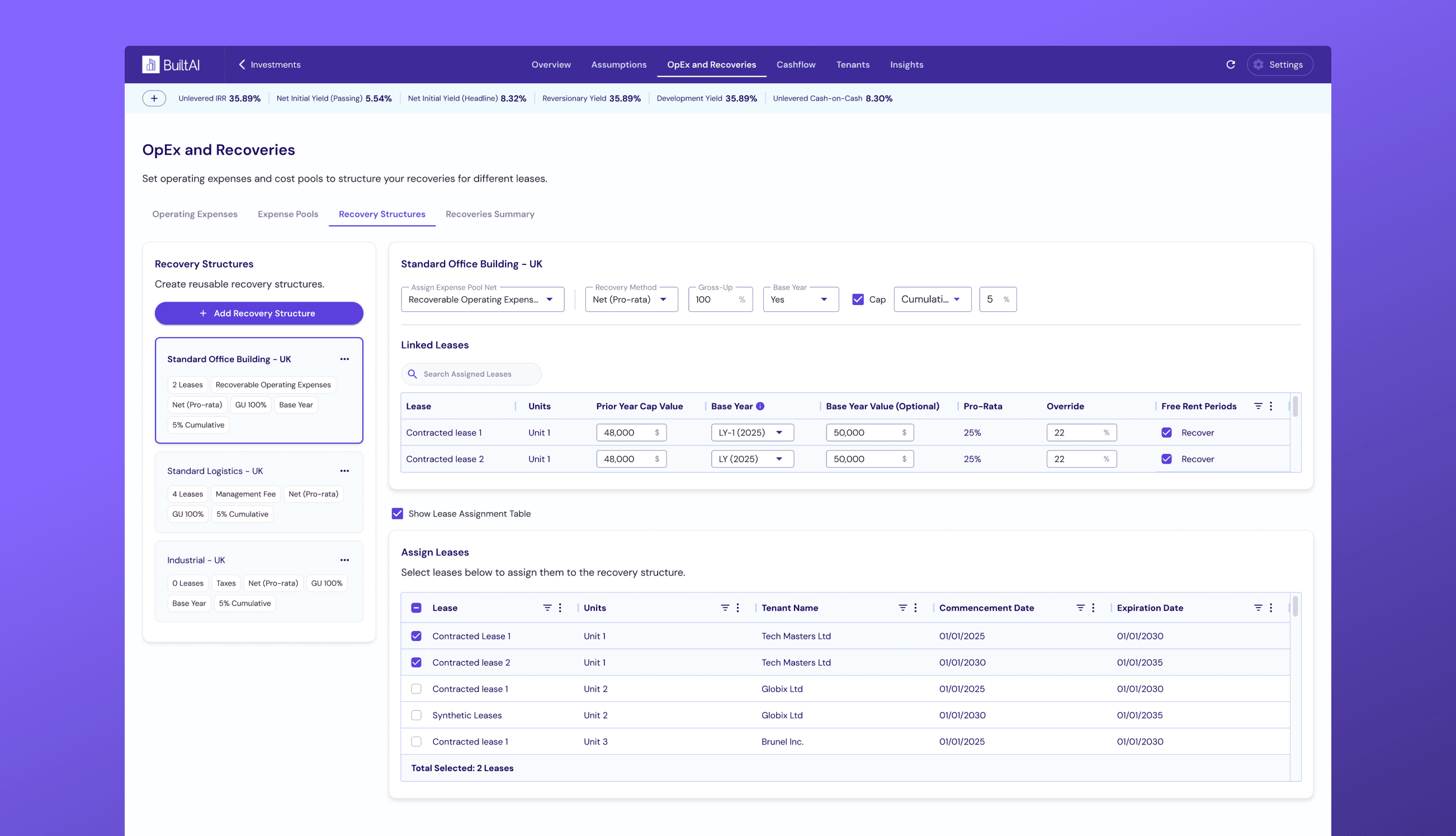 Once a structure is defined, it can be applied directly to leases from the same screen. Users can select contracted or synthetic leases from the 'Assign Leases' table and assign them in bulk, while also seeing which leases are already linked at the top. This makes it easy to manage and update recoveries without jumping between different views, and reflects how the logic works in practice: define the rules once, then apply them consistently across the portfolio.