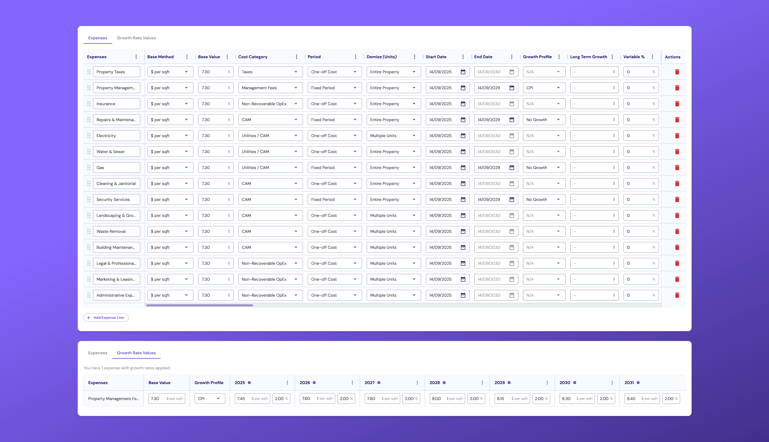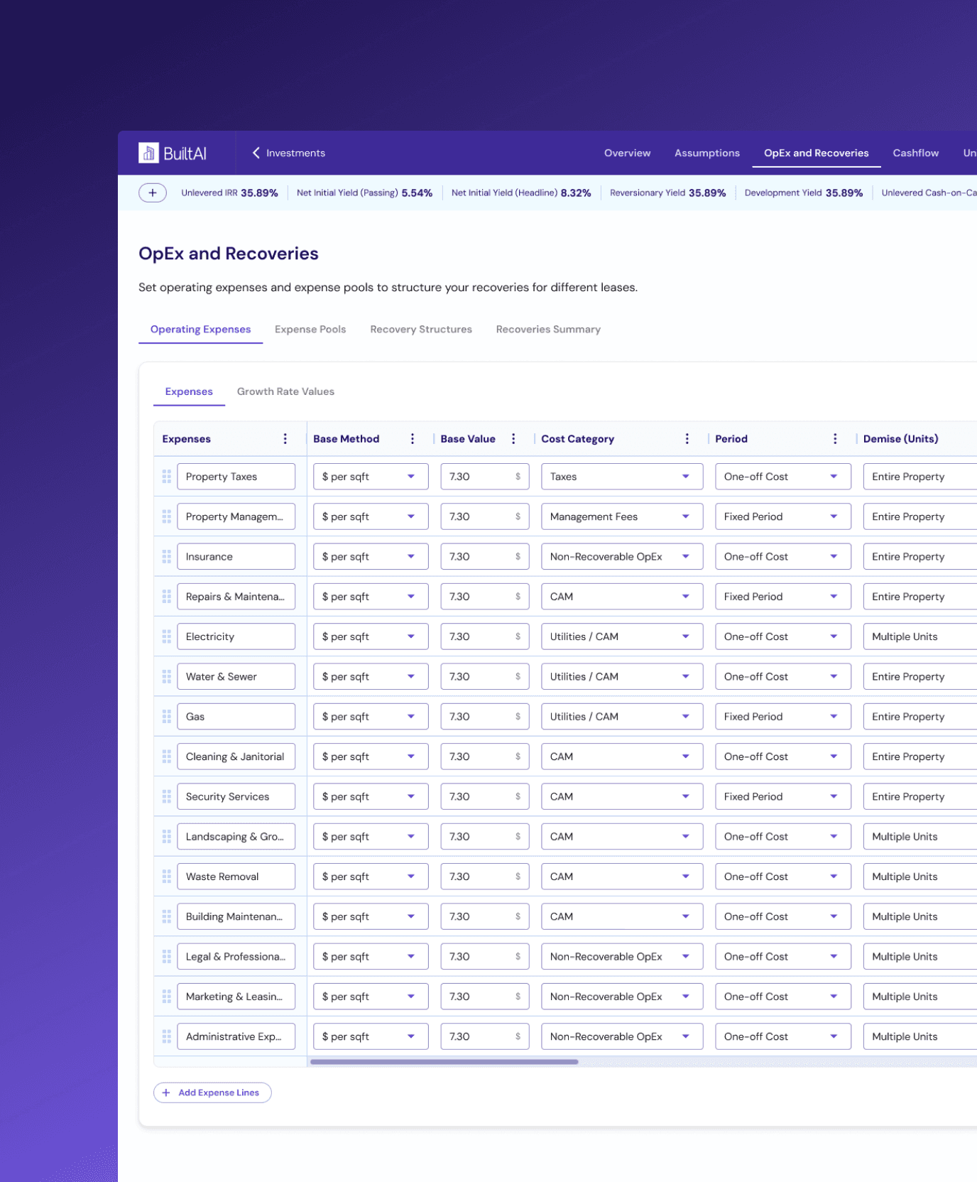 I've redesigned how operating expenses are defined and managed to better reflect how costs are handled in real-world scenarios. Instead of a rigid setup, users can add and structure costs at a granular level, assign clear categories like CAM, utilities, or non-recoverable, and control key variables such as time periods, growth, and variability over time. The focus was on balancing flexibility with clarity, allowing users to model detailed financial data while still understanding exactly what they’re inputting and how it behaves across the investment.