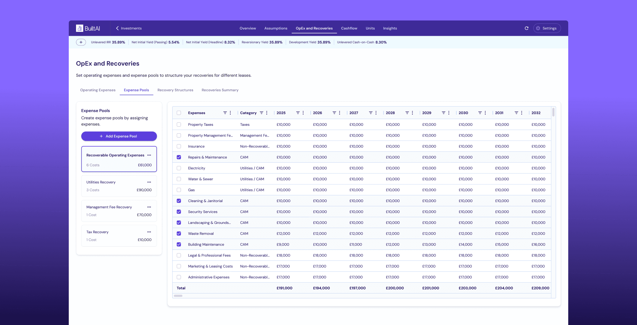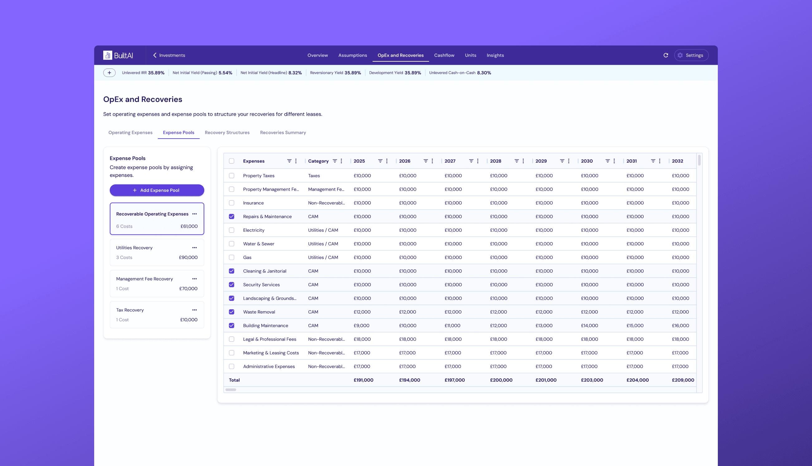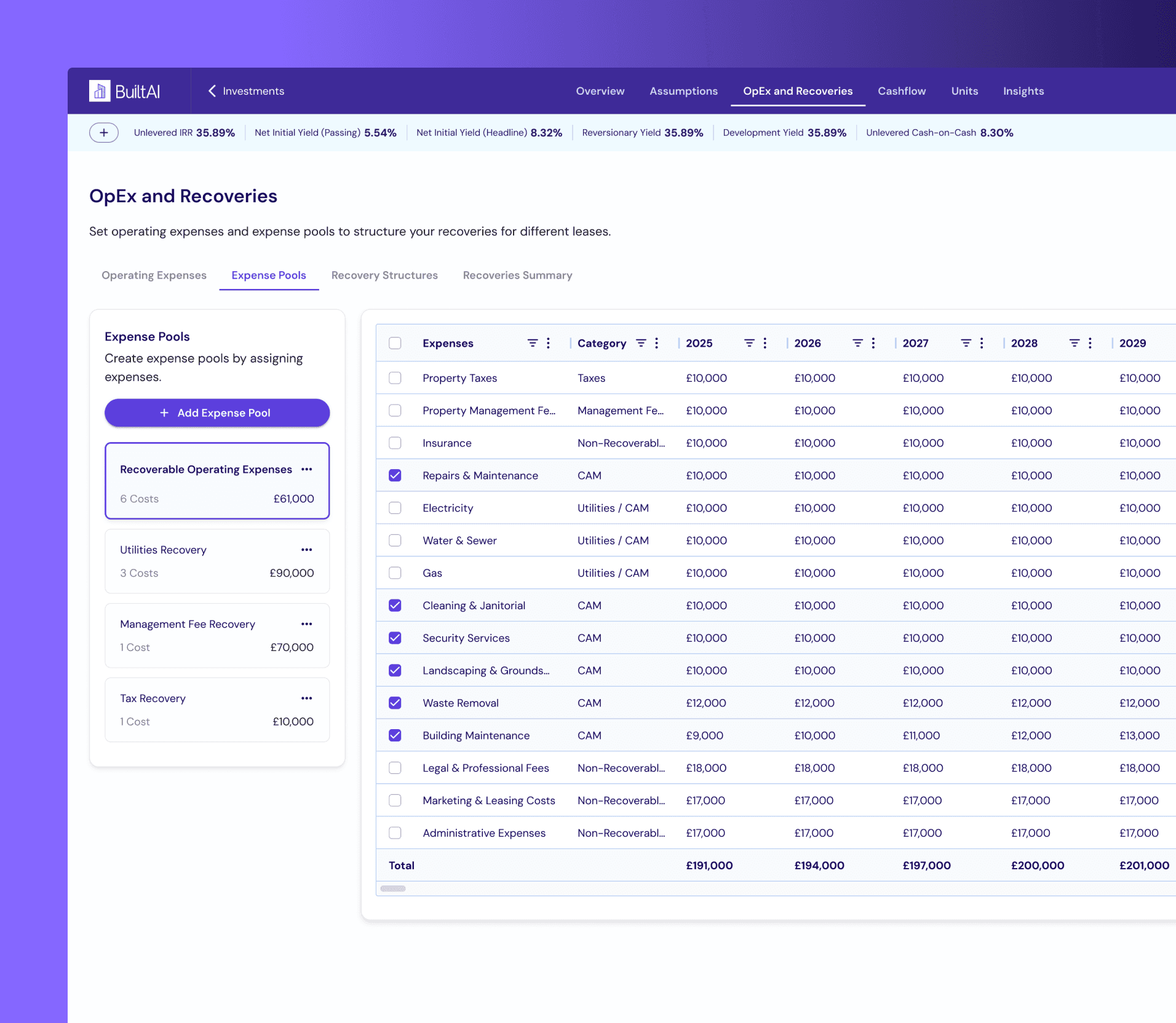We introduced a structured, layered system that breaks recoveries into three clear parts: operating expenses, where all cost lines are defined and modelled; expense pools, where costs are grouped based on how they should be recovered; and recovery structures, where rules like method, caps, and base year are applied and then assigned to leases. This creates a clear mental model from costs → pools → structures → leases, replacing a black-box setup with something much easier to follow. As a result, users can clearly understand what is being recovered, control how it’s recovered, and apply the same logic consistently across a portfolio.