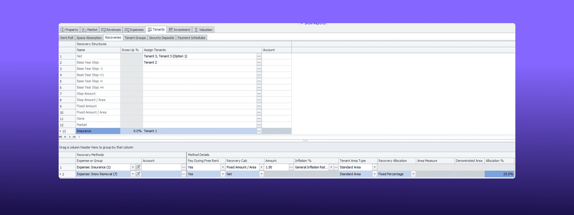 Recovery structures are where users define how costs are recovered, building on top of the expense pools created earlier. From this screen, users can select which pools are included, set the recovery method (net, fixed, pro-rata), and configure rules like base year, caps, and gross-ups. Instead of spreading this logic across different areas, everything sits in one place, making it much easier to understand what’s driving the recoveries and to reuse the same setup across multiple leases.