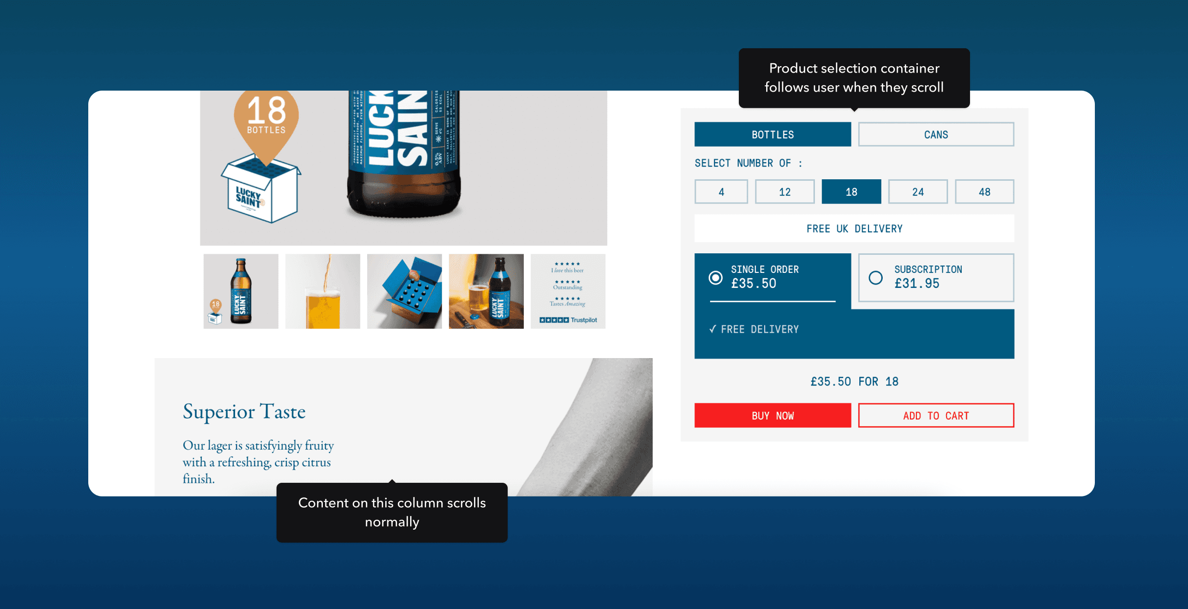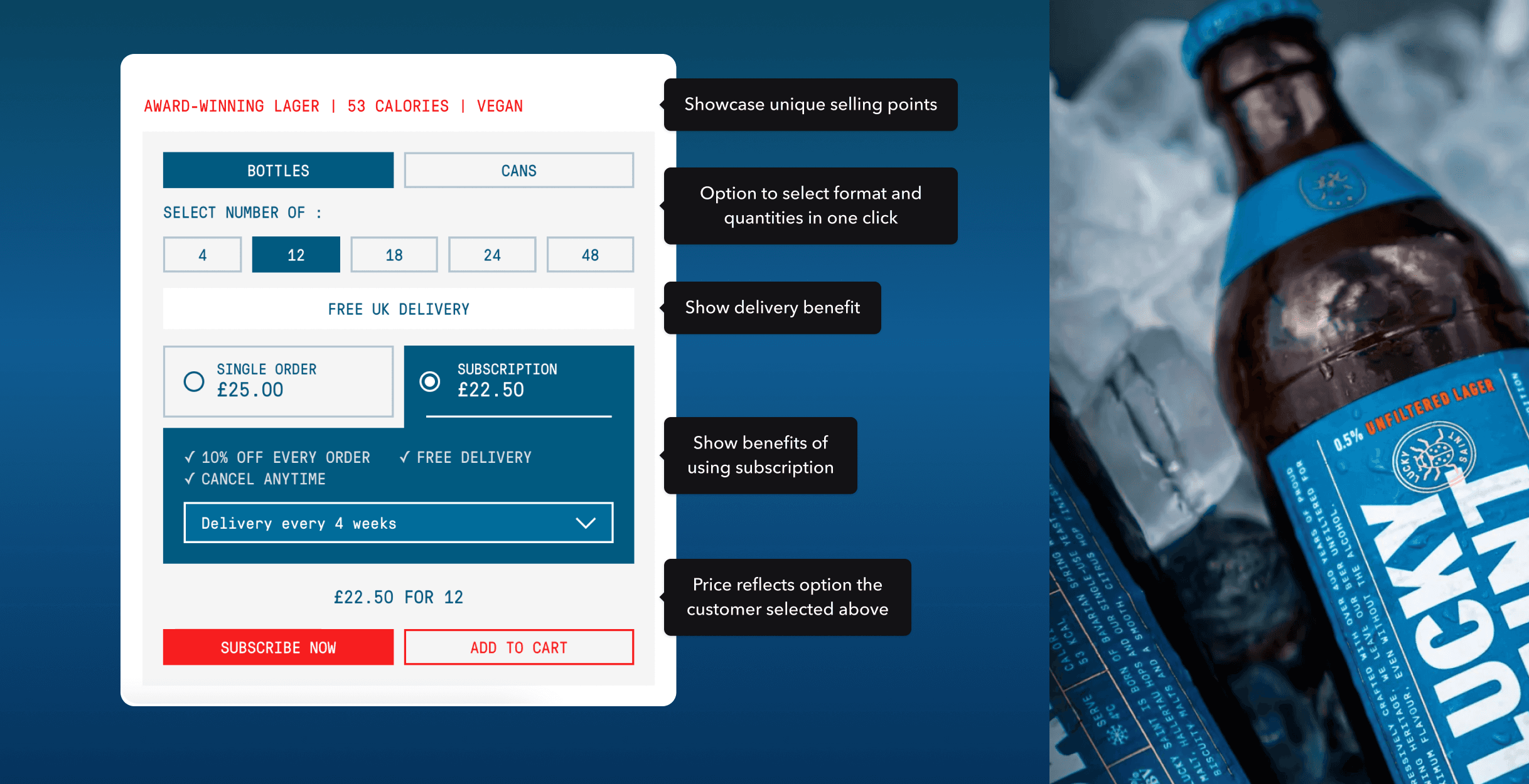 Lucky Saint wanted to improve their average order value and make it easier and quicker for users to see the price benefit of adding more bottles/cans.
