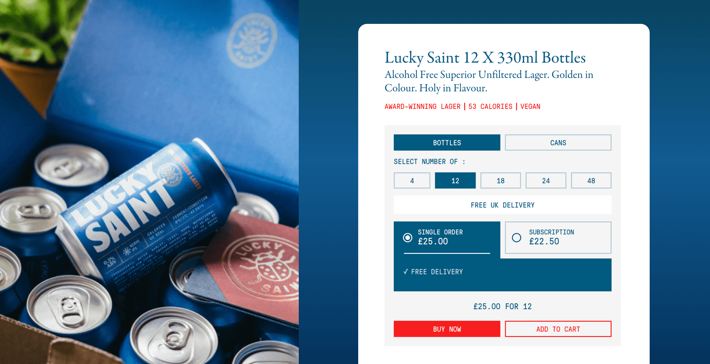Lucky Saint presented a unique opportunity for me to witness the remarkable transformation of an unknown brand into one of today's most renowned alcohol-free beers. In 2021, I was entrusted with the task of optimising their product page to drive conversions. The objective was to enable users to select multiple packages and subscribe to varying quantities, especially since the brand initially offered only one product. This approach aimed to facilitate larger purchases and increase customer lifetime value (CLV).